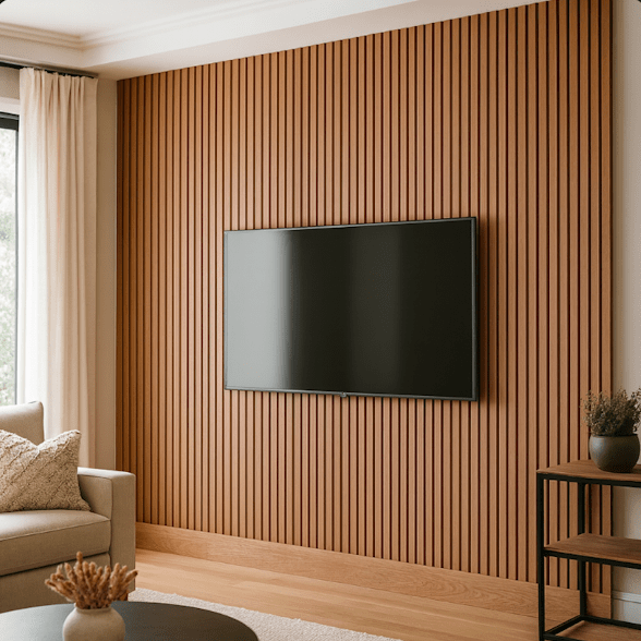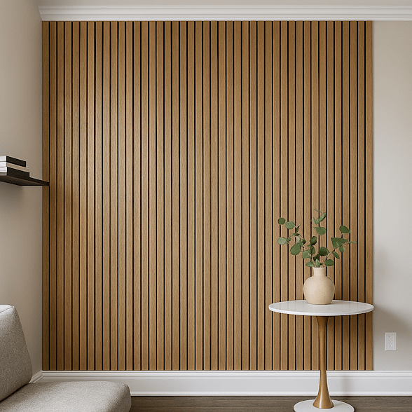 Includes design consultation, felt backing, solid wood slats, mounting, and finishing. Price varies by wood species, slat spacing, and wall height. Excludes LED lighting and custom staining. Most projects completed in 1–2 days.