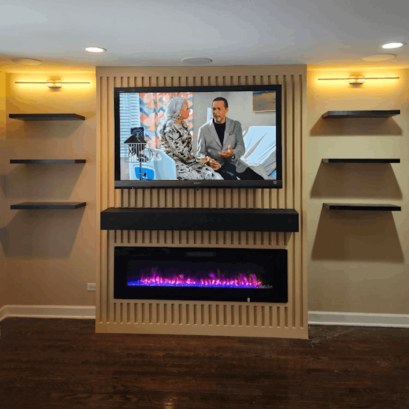 Includes custom layout design, TV mounting preparation, cable management channels, integrated lighting options, and installation of slat, wood, or decorative panel materials. Pricing varies based on materials, lighting complexity, and integrated shelving. Excludes major electrical rewiring or structural changes.